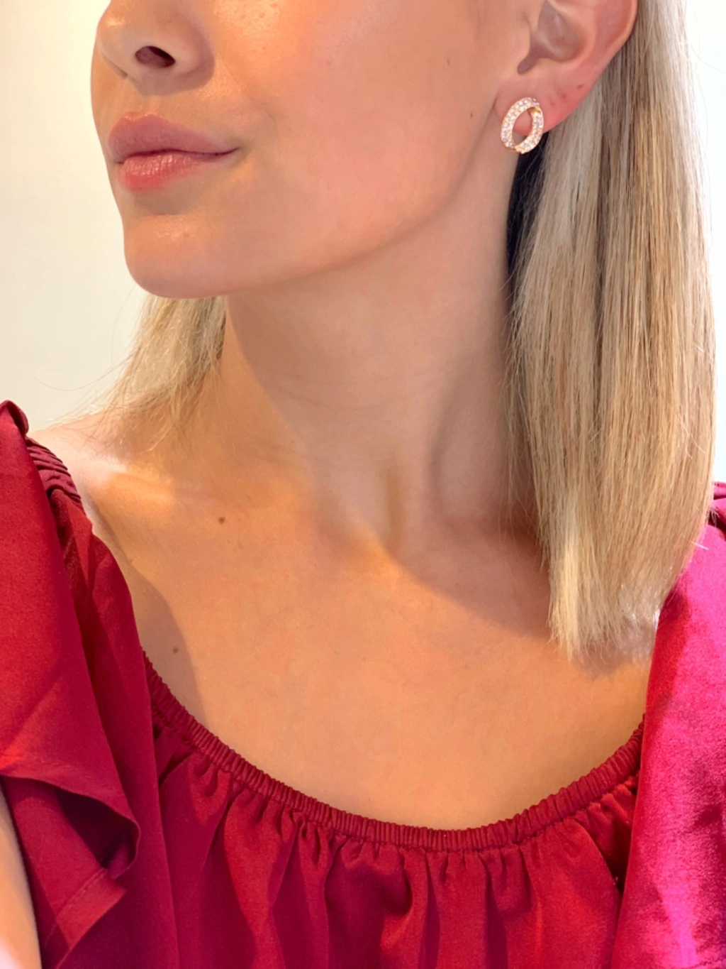 Amamos nuestros aros loana, sus cristales swarovski AB brillan junto a su baño de oro. su forma ovalada con movimiento hace que su diseño sea muy novedoso. Su tamaño permite usarlo a toda hora.