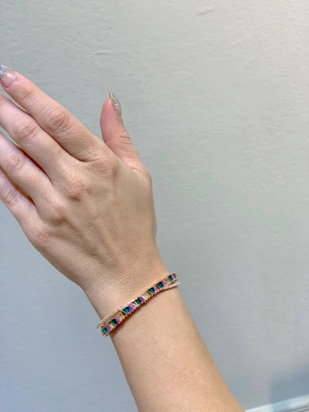 Nuestra pulsera Asia es la más buscada por ustedes porque tiene la dosis justa de elegancia y diseño! Este modelo doble posee cristales Zirconia Swarovski multicolores y cristal Pavé con aleación de metal y baño de oro rose. Su tamaño es regulable y ajustable a todas las muñecas.
