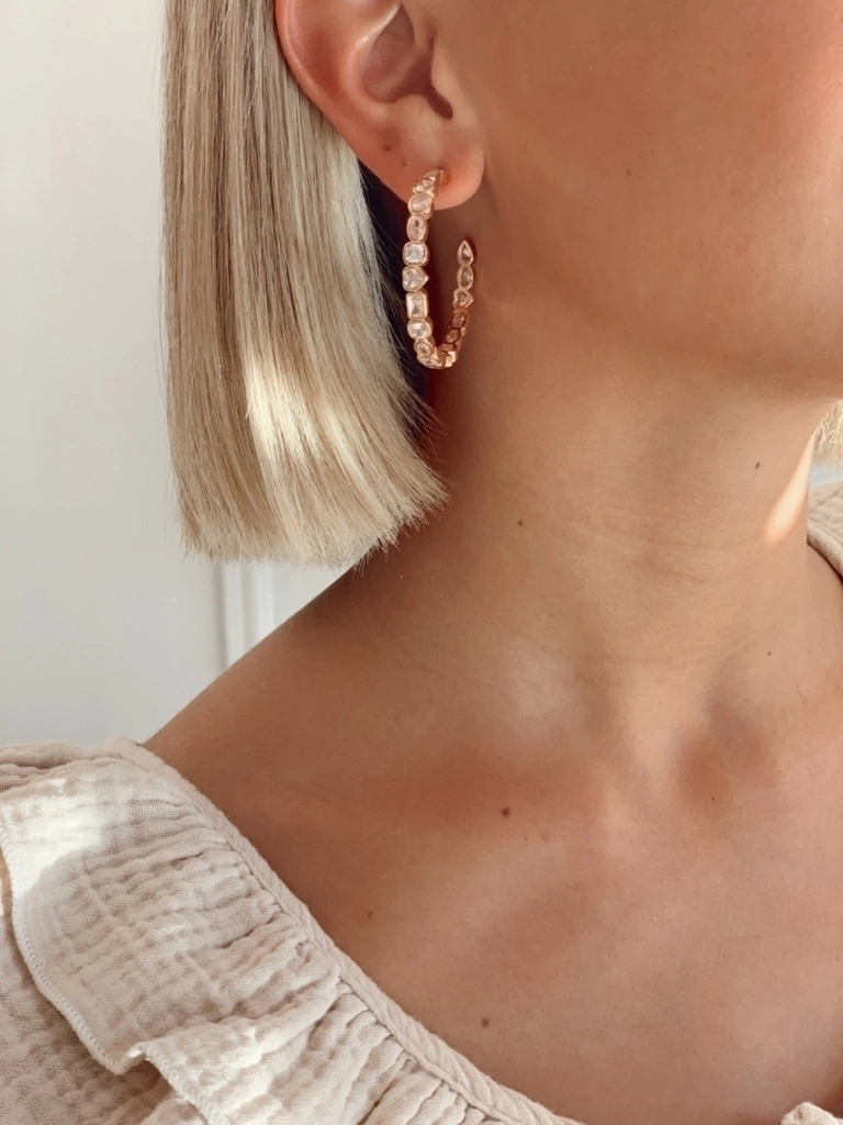 Este par de pendientes de Bonnie se caracteriza por sus siluetas sencillas y su resplandeciente elegancia. Cada aro está compuesto por una hilera de brillantes piedras blancas, expertamente talladas en resplandecientes formas ovalada, cuadradas y de corazon. Estos pendientes son una adición atemporal para tus looks de diario y resultan fáciles de combinar con otros accesorios a juego. Una bonita idea de regalo.