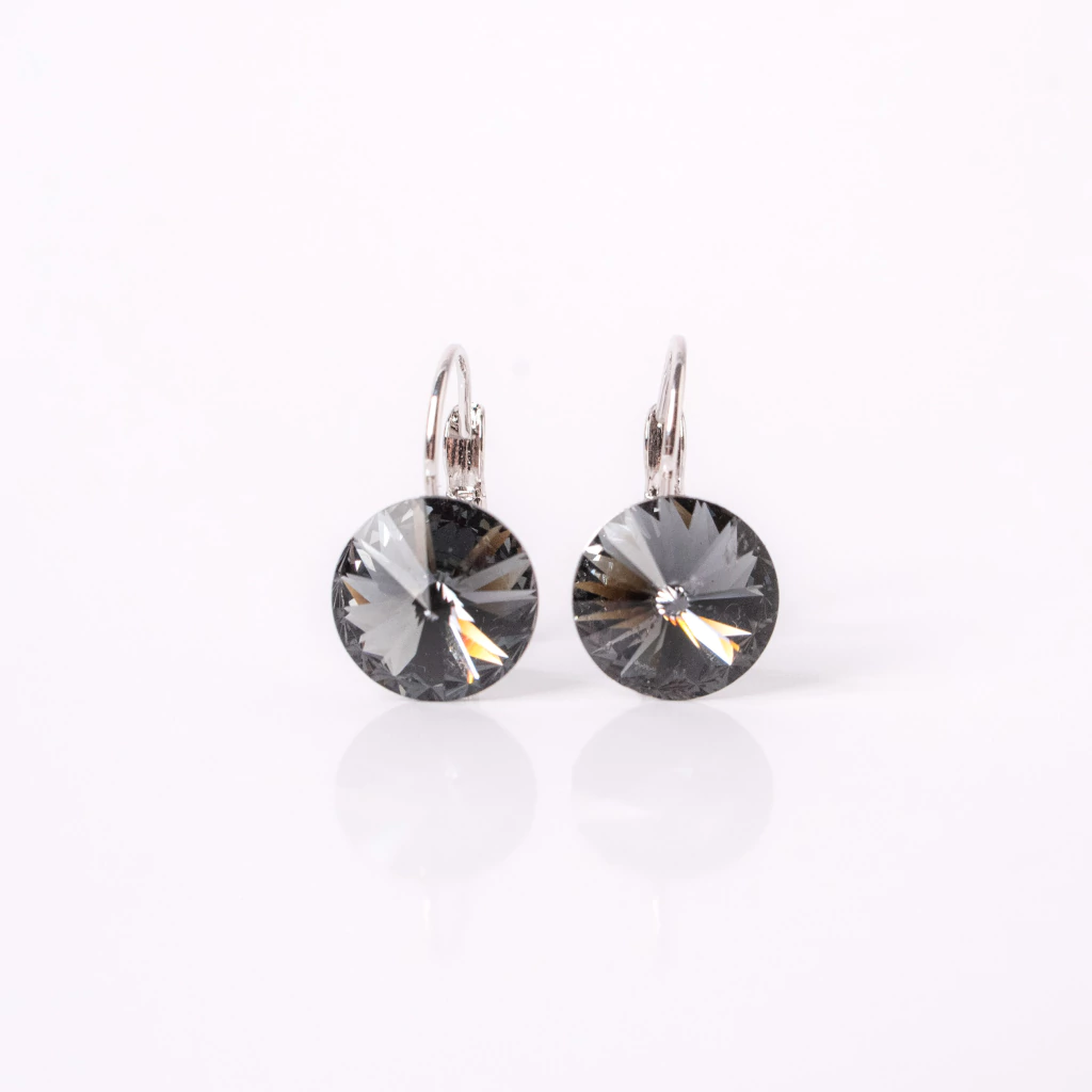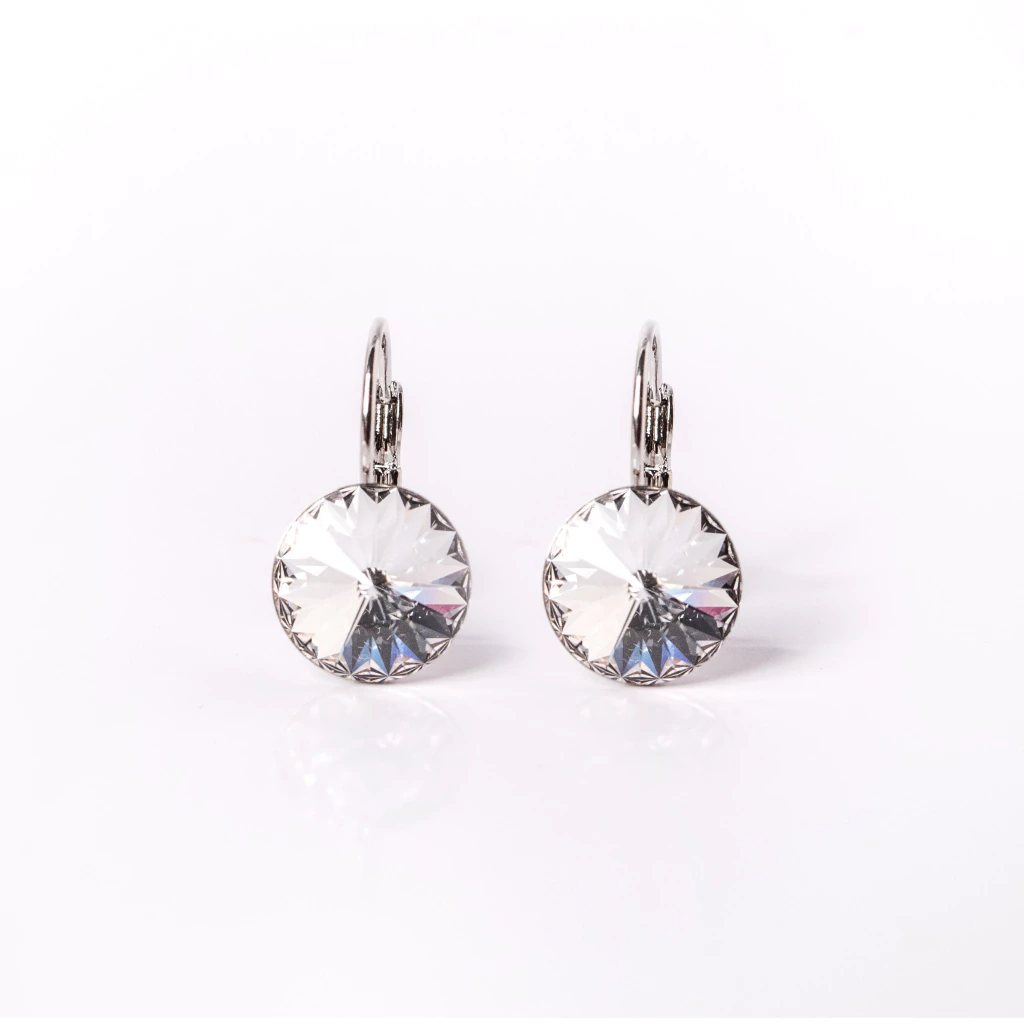 Este increíble par de aros está confeccionado con cristal Swarovski y aleación de metal con baño de rodio, ideal para usar a toda hora y complementar tu look. Diámetro del cristal 1.2 cm