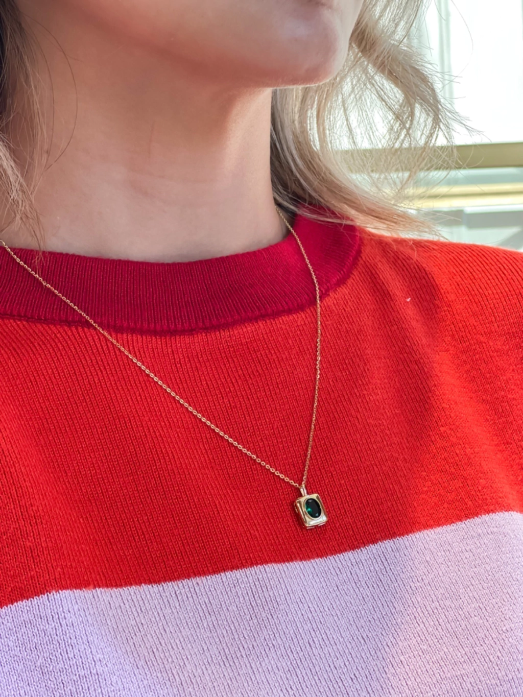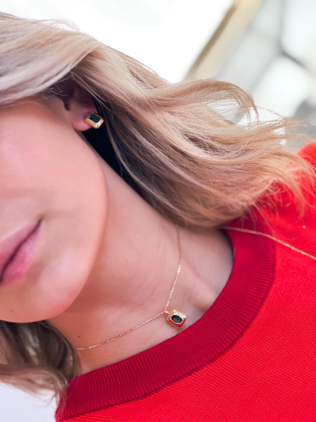 Amamos los diseños vanguardistas y este es uno de ellos, su cristal Swarovski color esmeralda y su baño de oro hacen que este collar sea el centro de todas las miradas.