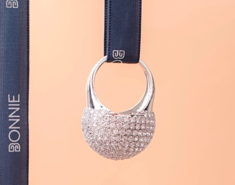 Este imponente anillo hará que seas el centro de todas las miradas, imponente y elegante será un imprescindible para tus outfit de fiestas. Confeccionado con cristal pavé y aleación de metal con baño de rodio.