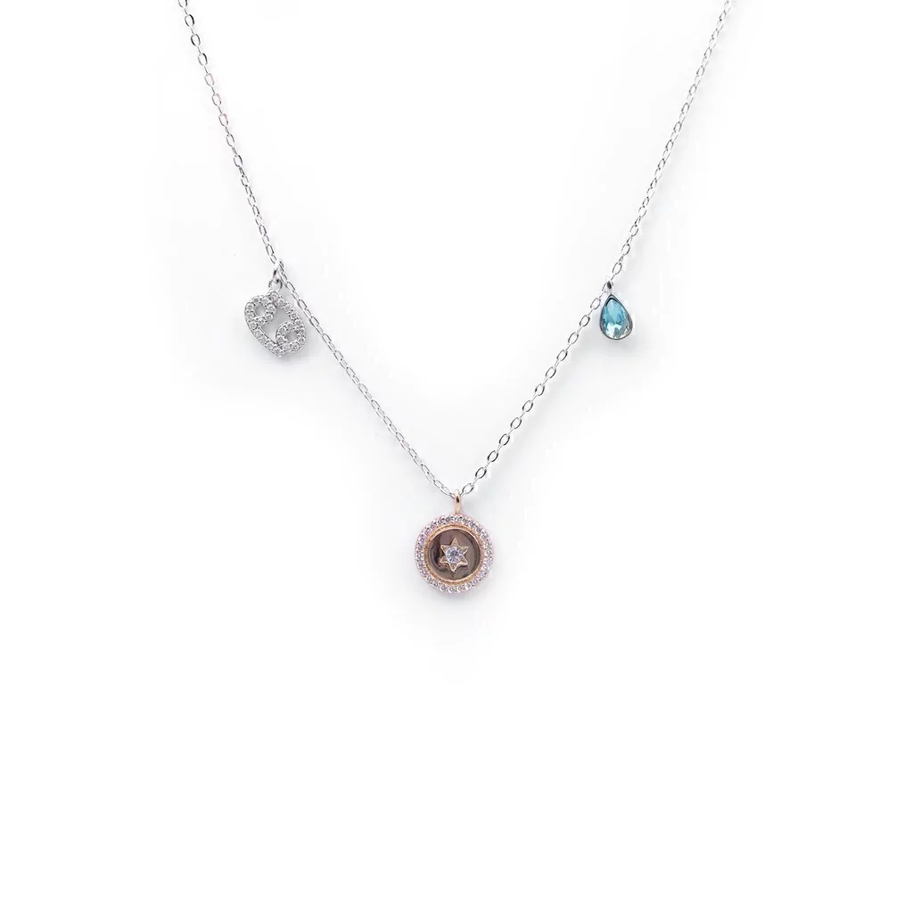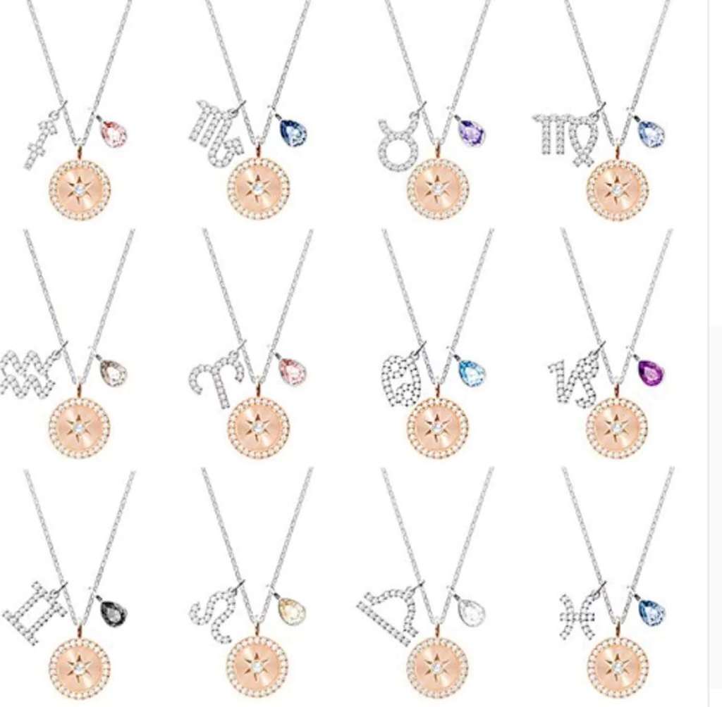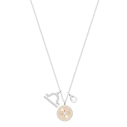 Este colgante que representa al signo del zodiaco es una pieza realizada en metal con baño de rodio y 1x1.5 cm (3/8x5/8 pulgadas) y una cadena de 38 cm (14 7/8 pulgadas), la pieza brilla con un símbolo decorado con pavé. El medallón central y la piedra en forma de pera están confeccionados con cristal Swarovski